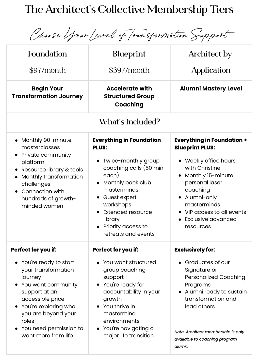 The Architect's Collective is where women transform together through monthly masterclasses, genuine community, and proven frameworks. Choose your level of support as you journey from feeling lost to living aligned.